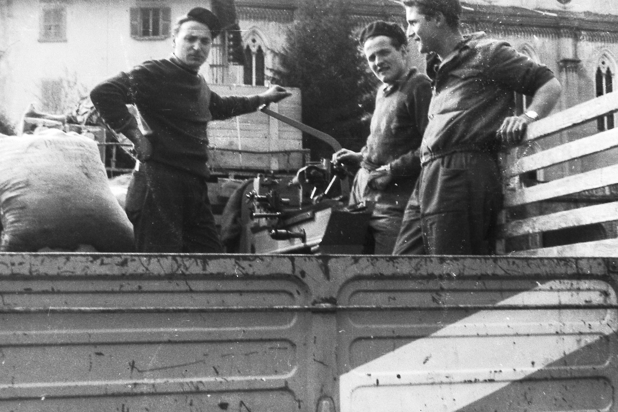 Caricare una macchina non era cosa da poco …. i muletti e le grù a braccio non esistevano e tutto doveva essere fatto con il “paranco manuale” che veniva montato sul tre piedi.