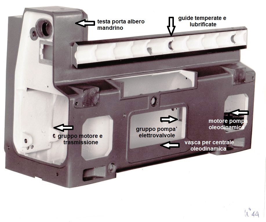 Grande impegno fu dedicato alla costruzione del basamento in un unico pezzo, perciò un monoblocco di ghisa che comprendeva la base con la vasca per la centrale oleodinamica, la testa o supporto per il mandrino e le guide prismatiche per lo scorrimento del gruppo sgorbie.