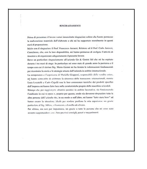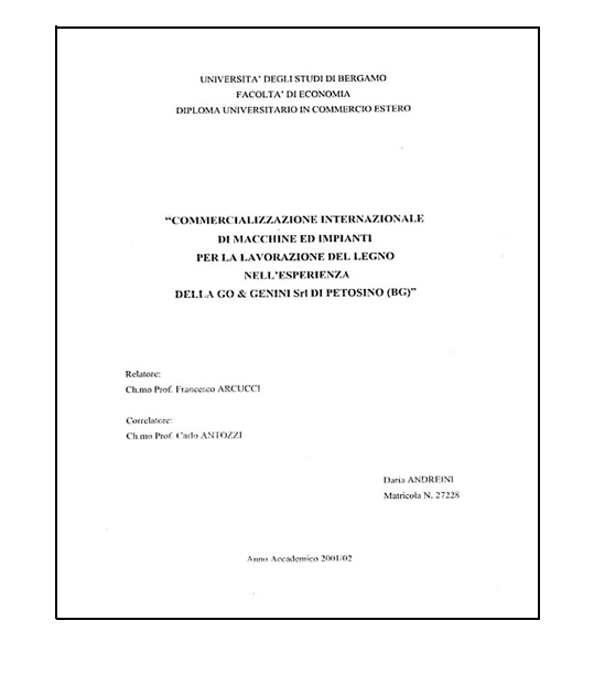 Non fu l’unica tesi universitaria scritta KOMBI ACW che l’azienda Genini ispirò come prova d’esame. Nell’anno accademico 2002 Daria Andreini, matricola 27228 dell’Università di Bergamo – facoltà di economia con diploma di commercio estero scrisse la sua tesi dal titolo “Commercializzazione Internazionale di macchinari e impianti per la lavorazione del legno nell’esperienza della GO & GENINI srl di Petosino BG”.