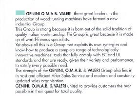 “GENINI – OMAB – VALERI tre grandi leader nella produzione di macchine per la tornitura del legno hanno formato un nuovo Gruppo Industriale. Questo gruppo è forte perché nasce dalla solida tradizione della qualità artigiana Italiana. Questo gruppo è grande perché è formato da specialisti di fama mondiale. Ma soprattutto si tratta di un Gruppo che sfrutta le proprie sinergie e il proprio Know how per produrre una gamma completa di macchine tecnologicamente innovative: strumenti pienamente conformi alle norme CE e UL e pronti, data la loro varietà e prestazioni, a soddisfare ogni possibile esigenza. La forza della Ge.O.Va Export risiede anche in un vasto ed efficiente servizio post vendita e in un’organizzazione commerciale moderna e costantemente aggiornata. GENINI – OMAB & VALERI uniti per offrire ai clienti il meglio possibile nella loro ricerca della qualità totale.”